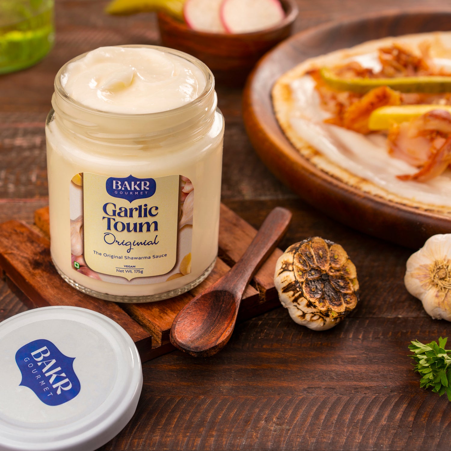 Toum is a middle eastern garlic sauce that makes all the difference in a shawarma. its what gives you the tangy, garlicky flavor with just the right amount of kick. Apart from Shawarma, you can add it to any sandwiches, rolls, use as dips for chips, fries and the list goes on.