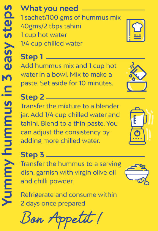 Shelf Life - 12 months Weight - Hummus mix 90 gms - Tahina 40 gms - Extra virgin olive oil 25 gms Ingredients - chickpea flour, salt, citric acid, cumin powder, extra virgin olive oil, sesame seeds |