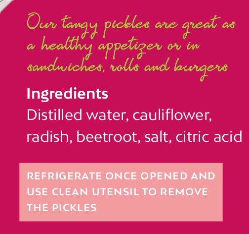 Shelf Life - 8 months Weight - 500 gms Ingredients - cauliflower, radish, beetroot, salt, citric acid |