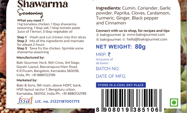 Shelf Life - 12 months Weight - 100 gms Ingredients - cardomom, cumin, coriander, garlic powder, paprika, black pepper, cloves, cinnamon, ginger and turmeric |